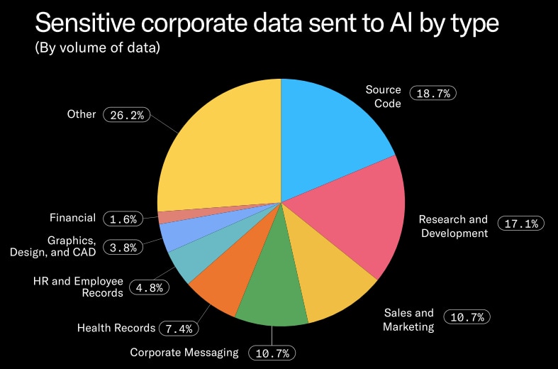 この調査結果によると、従業員がAIツールに入力される機密データとして最も多いのはソースコードで18.7%、次いで財務資料などの機密情報が17.1%を占めています。