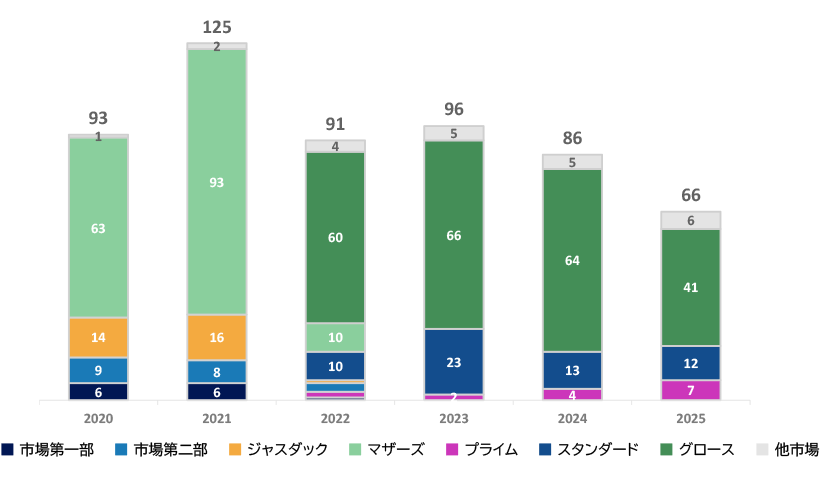 出典:東証調べ 2025年1~12月のIPOは66社と大幅減 : Webマール : M&A情報データサイト