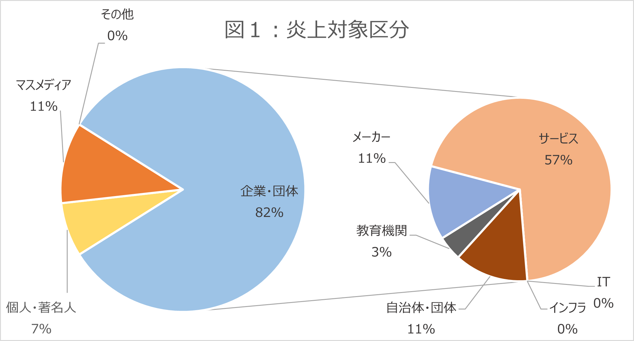 また、どのような業態が炎上したのかを示す「企業・団体」の炎上区分の内訳は、「サービス」が57%(7ポイント増)と全体の半数以上を占めました。さらに「自治体・団体」と「メーカー」がそれぞれ11%(3ポイント減)となり、「教育機関」が3%(3ポイント増)と続きました。(図1)