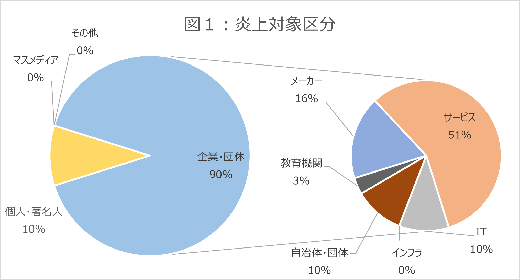 また、どのような業態が炎上したのかを示す「企業・団体」の炎上区分の内訳は、「サービス」が51%(19ポイント増)と大幅なポイント増加となりましたが、前月までの平均値に戻っています。次いで「メーカー」が16%(2ポイント増)、「自治体・団体」が10%(3ポイント増)、「教育機関」は3%(3ポイント増)という結果になりました。(図1)