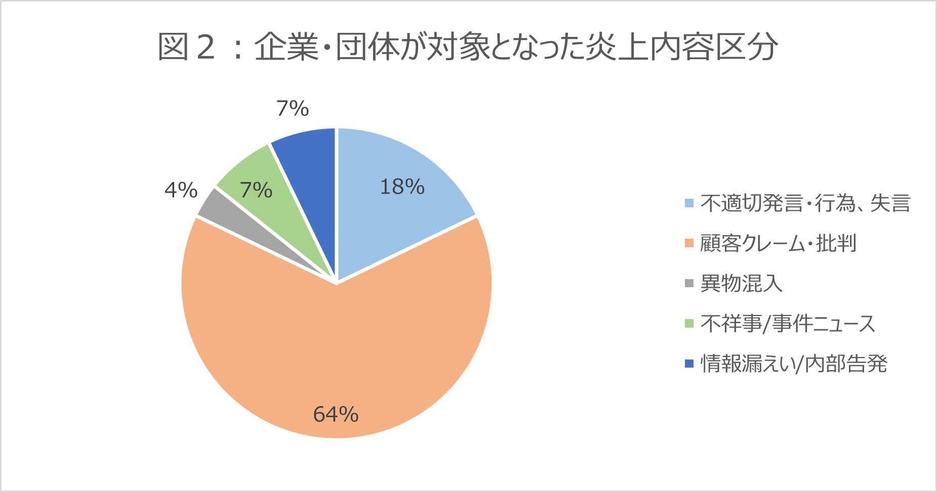 「企業・団体」を対象とする炎上内容における分析では、「顧客クレーム・批判」が64%(5ポイント増)と全体の6割以上を占めています。さらに「不適切発言・行為、失言」が18%(14ポイント減)、「情報漏えい/内部告発」(7ポイント増)と「不祥事/事件ニュース」(2ポイント増)がそれぞれ7%、「異物混入」が4%(前月同数)という結果となりました。(図2)