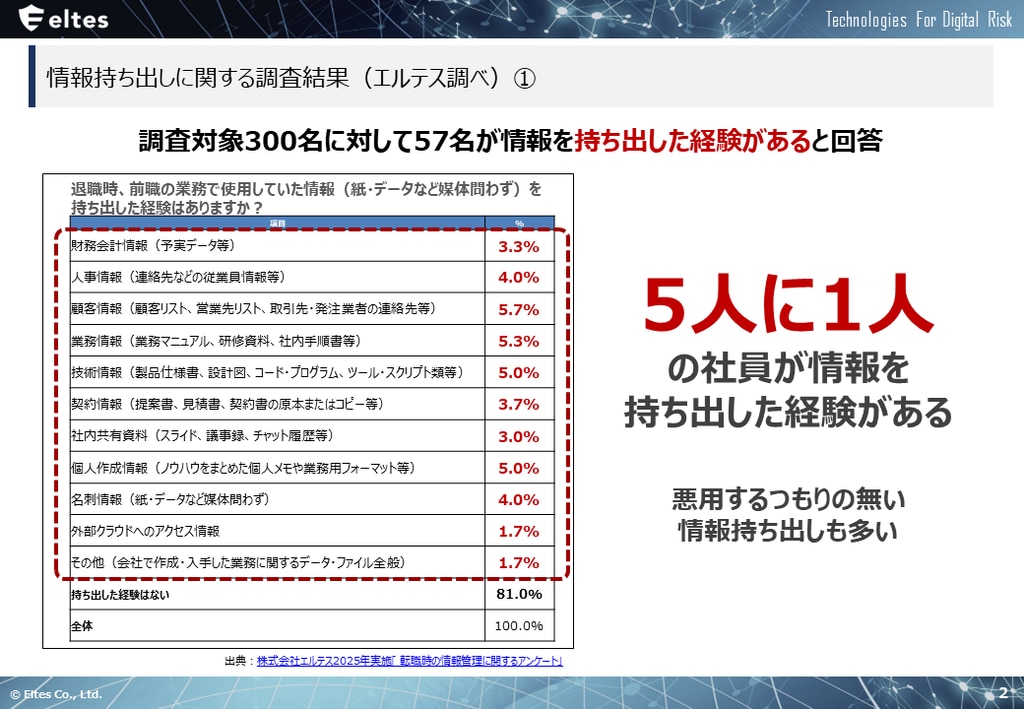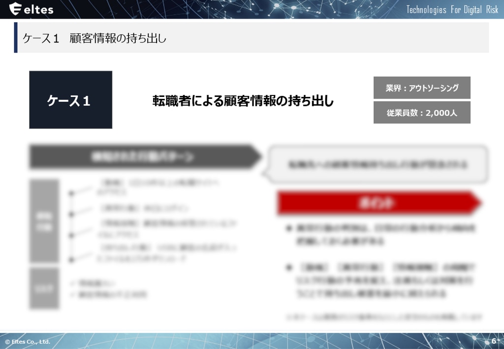 多くの企業で元従業員や業務委託先などの企業関係者による情報持ち出しインシデントが発生しております。特に、転職時に活用するため内部情報を持ち出すケースが発生しています。
