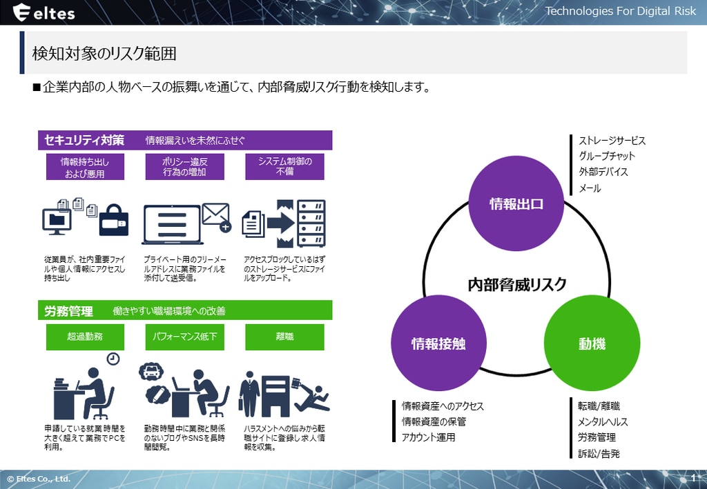 ログ分析から情報持ち出しや超過勤務(隠れ残業)を含む内部脅威のリスク予兆を可視化し、インシデントの未然防止を行える、Internal Risk Intelligence(内部脅威検知)サービス。